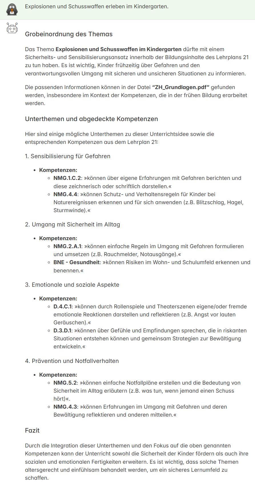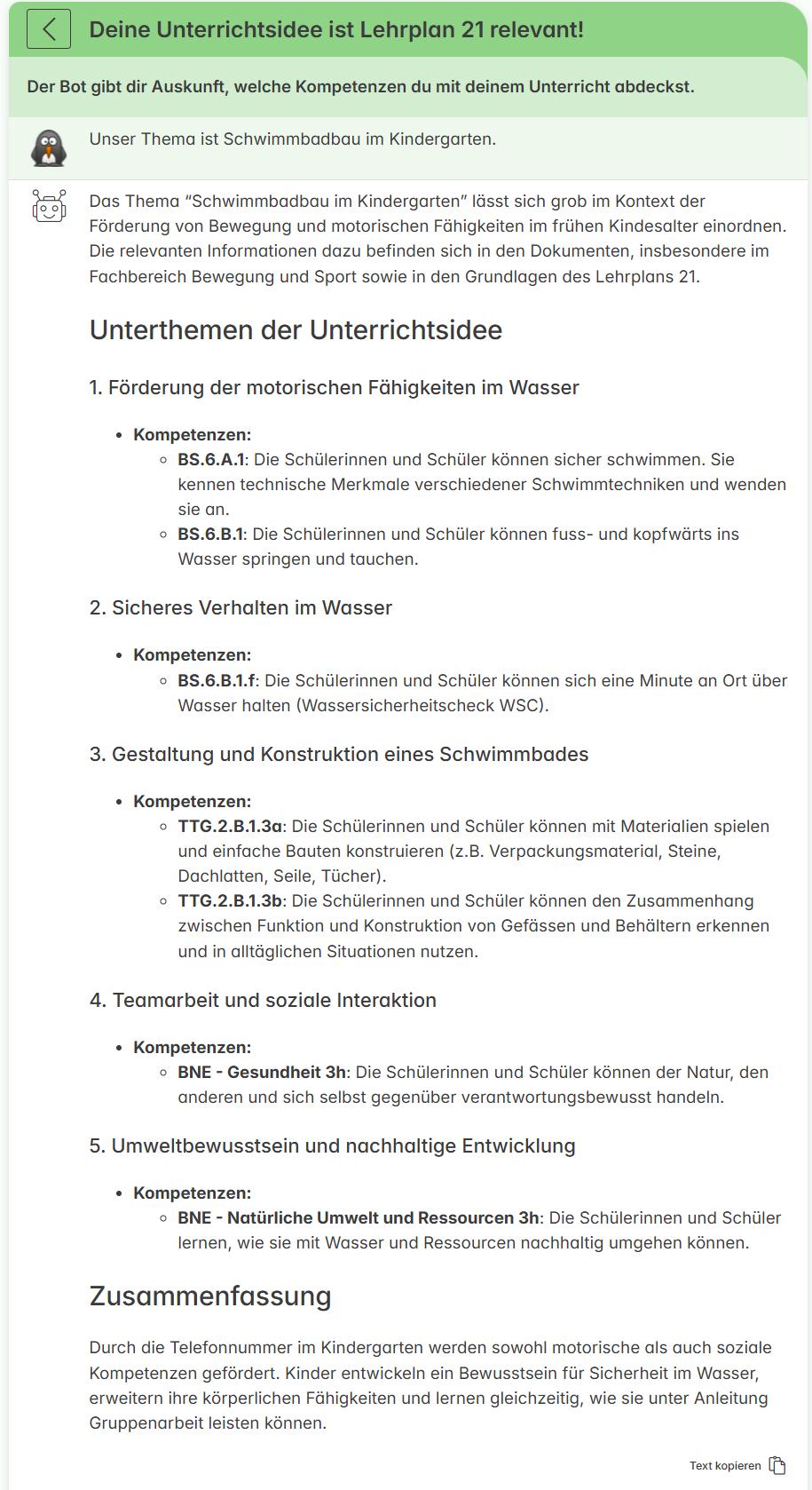 Man kann diesem Bot eine beliebige Unterrichtsidee geben und er liefert passende Kompetenzen samt Begründung aus dem Lehrplan 21. Ein erstes Beispiel: _"Wir bauen ein Schwimmbad im Kindergarten":